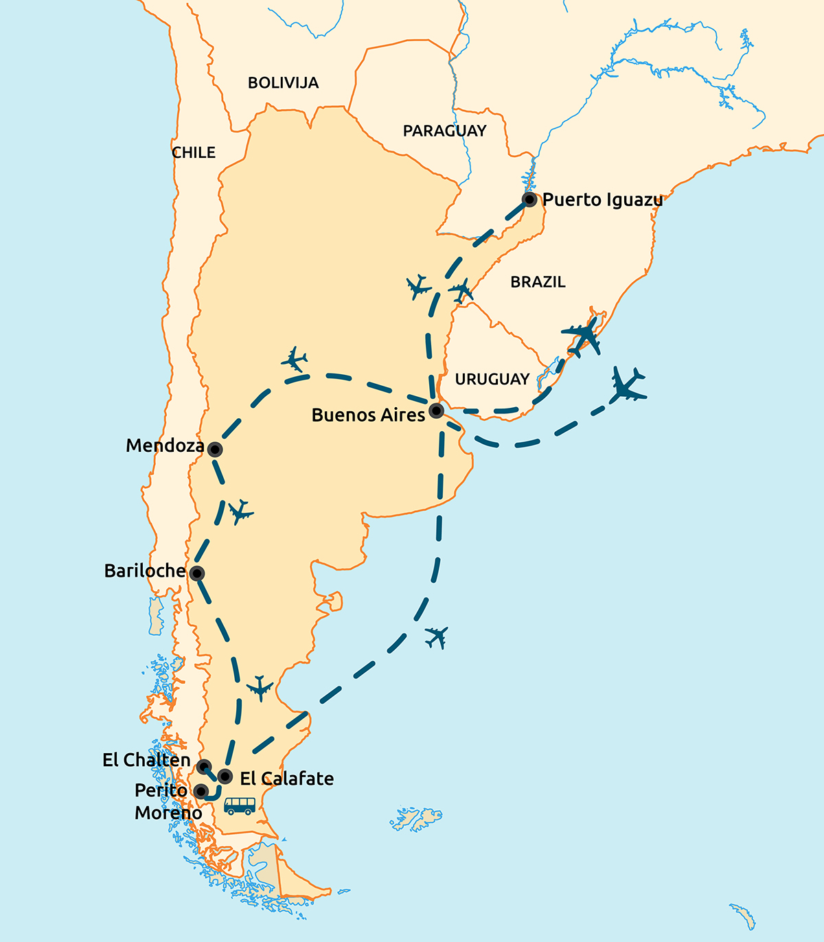 Prevoz iz Ljubljane in jutranji let iz Benetk v Južno Ameriko, z enim krajšim prestopanjem. Pristanek v Buenos Airesu v večernih urah isti dan.