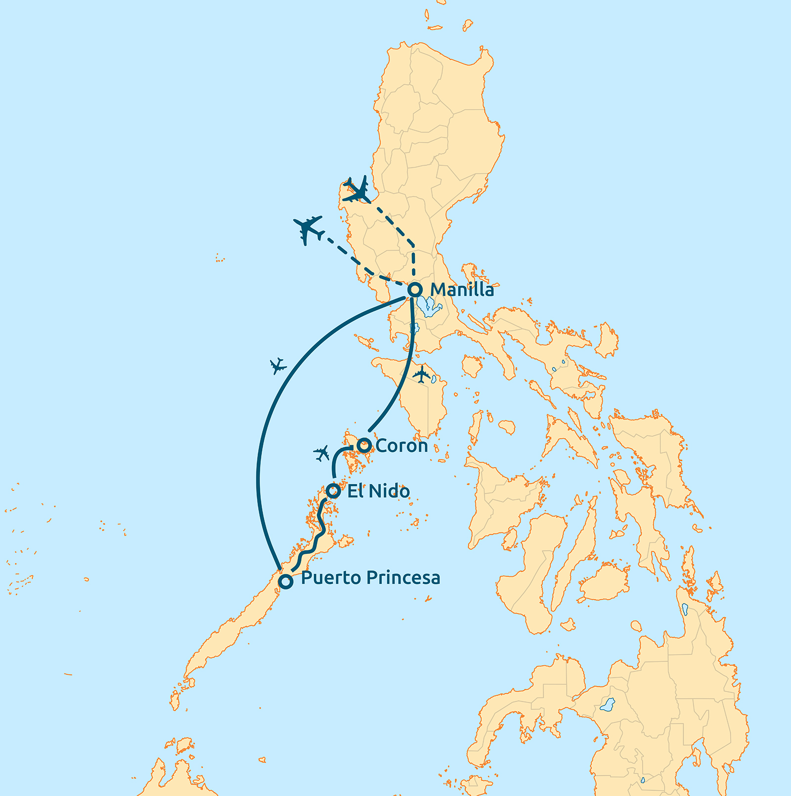 Filipini so arhipelag tisočerih, med seboj različnih otokov. Ponekod apnenčasti osamelci slikajo dramatične kulise, drugod je toplo morje turkiznih barv, povsod pa nasmejani domačini polepšajo dan. Raziskovali bomo najlepše kotičke Palawana in Corona, dveh otokov, ki ju obiskovalci uvrščajo med najlepše v jugovzhodni Aziji. Iz prestolnice Manile se bomo najprej podali v Puerto Princeso, kjer nas pričaka sproščen utrip otoškega življenja, zgodovina, skrita v kolonialnih stavbah, in podzemna reka, ki sodi med sedem novih naravnih čudes sveta. Razgledna vožnja nas nato popelje na drugo stran otoka, v El Nido, s čistim morjem v slikovitih zalivih, z odmaknjenimi otočki in z belimi peščenimi plažami. Z ladjico raziščemo arhipelag Bacuit, plavamo med živo pisanimi ribicami in koralami ter se sprostimo v prelepi naravi. Na otoku Coron nas čakajo kristalna jezera, skrivnostne lagune in spokojne plaže, kjer čas teče počasneje. Med plavanjem, "snorklanjem" ali le poležavanjem na mehkem pesku bomo začutili tropski "odklop". Zadnji dan namenimo odkrivanju stare Manile, kjer kolonialna preteklost še živi v kamnitih ulicah Intramurosa. Tu se tradicionalne zgodbe prepletajo s kontrasti sodobne prestolnice. Na potovanju bomo poiskali stik z naravo, se umaknili od vsakdana in doživeli Filipine v delu leta, ko je vreme najlepše.