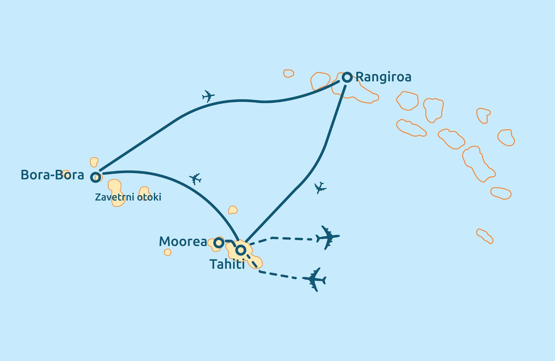 Kombiji, letala, kolesaFrancoska Polinezija daleč sredi Pacifika ima najbolj modro vodo v lagunah in v njej obilje rib. Na goratih zelenih otokih iz gozdov priteka pitna voda in omogoča odlične pogoje za pridelavo poljščin in tropskega sadja. Idilično življenje Polinezijcev na otokih obilja je barvito upodobil že slikar Paul Gauguin. Še danes so ti otoki slikoviti, kot so bili v filmih Upor na ladji Bounty. In še vedno imajo zelo ohranjeno naravo, tudi zato, ker ima Francoska Polinezija na 121 otokih, med katerimi je 2000 kilometrov modrine oceana, samo 280.000 prebivalcev (in je njihov vpliv na naravo majhen). Večina jih živi na šestih Družbenih otokih, največ na Tahitiju, upravnem središču z mednarodnim letališčem. Spoznavali bomo izbrane otoke: Zelen otok visokih gora Tahiti, dva slikovita gorata otoka obdana z modrima lagunama Mooreo in Boro Boro ter na koncu še odmaknjen atol Rangiroa v arhipelagu Tuamotu, ki se že na prvi pogled razlikuje, Rangiroa je ena sama velika modra laguna - koralni prstan sredi oceana. Na izletih po turkizno modrih lagunah bomo občudovali korale in številne živo pisane ribice. Plavali bomo s skati, morskimi želvami in z majhnimi lagunskimi morskimi psi. Na otočkih v laguni bomo imeli piknik kosilo. Na goratih otokih bomo občudovali slapove, bujno notranjost in starodavna svetišča - maree. Na Tahitiju, Moorei in Bora Bori bomo nastanjeni v udobnih hotelih ob plaži. Na atolu Rangiroa pa bomo v preprostih hišicah, tudi tu z lastno kopalnico, med laguno na eni strani in oceanom na drugi strani ozkega pasu kopnega. Tam, kjer se ocean dotika neba, Francoska Polinezija ponudi sončne zahode, ob katerih človek samo utiša misli in si napolni srce. Prijazno vabljeni v osrčje Polinezije! Ia ora na!